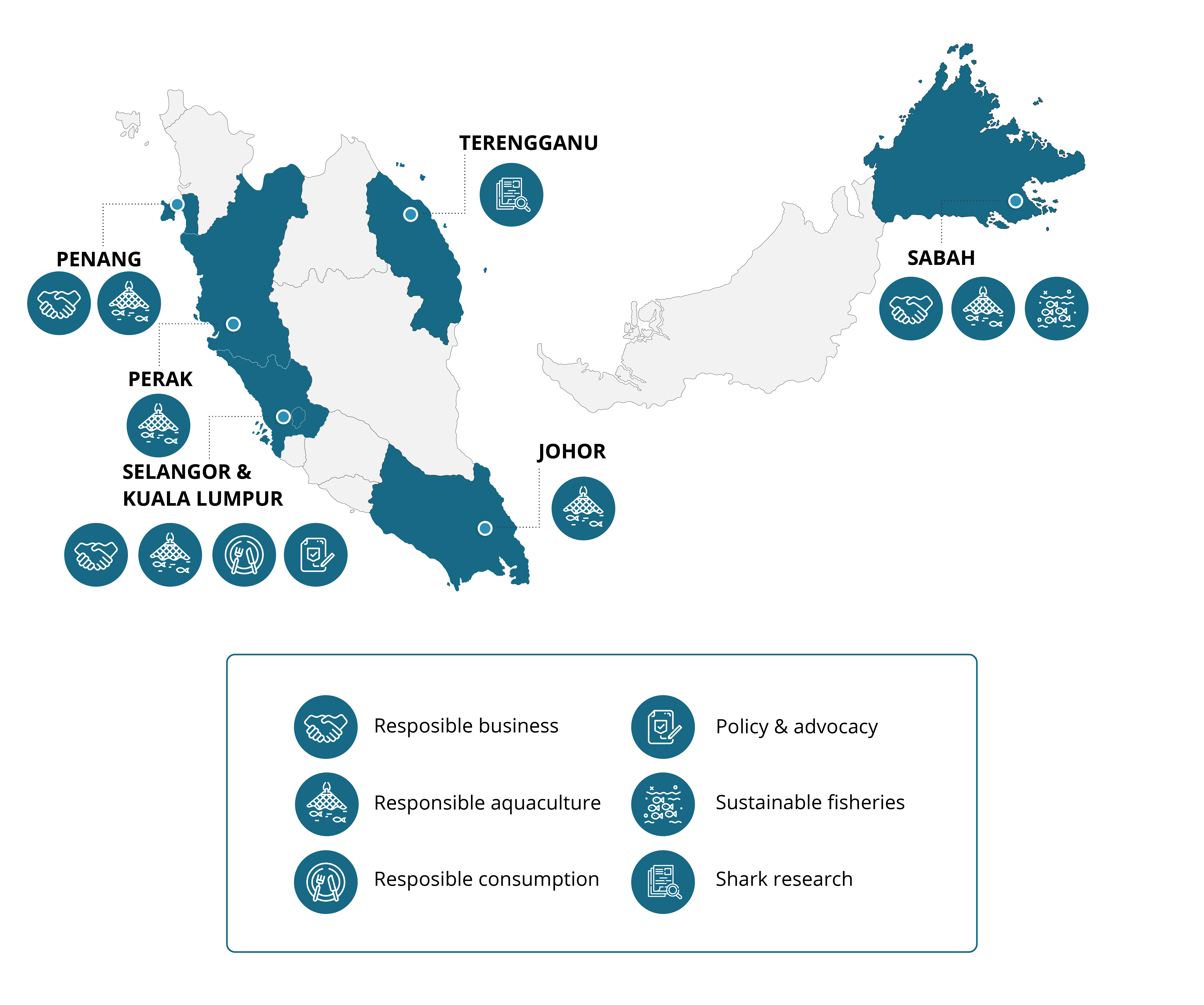 For Fisheries, we provide support to fishing communities in adopting and implementing sustainable fisheries initiatives that include implementing community-based fisheries projects, establishing baselines, and monitoring efforts to address overfishing of commercially valuable fishes in Malaysia.